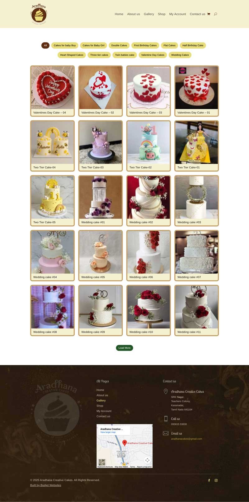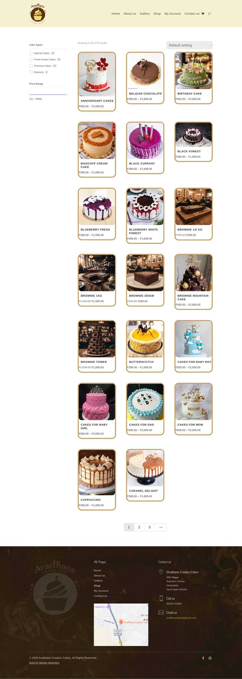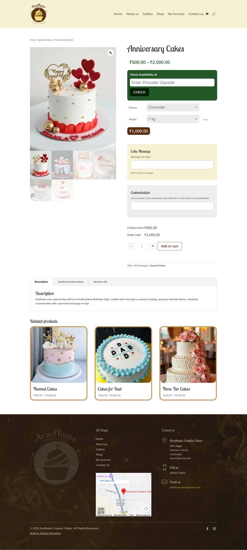 Aradhana Cakes (Bakery) WordPress + Woocommerce Home Page Single Product Page Filterable Gallery Page Shop Page